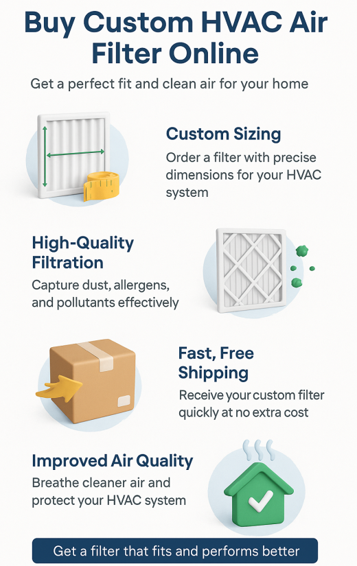 When it comes to clean, healthy air, the right filter makes all the difference. At FilterBuy, we make it simple to buy custom HVAC air filters online—no guesswork, no wasted trips to the store. With over 600 standard sizes plus true custom options, every filter is built to your exact specifications in our U.S.-based facilities.